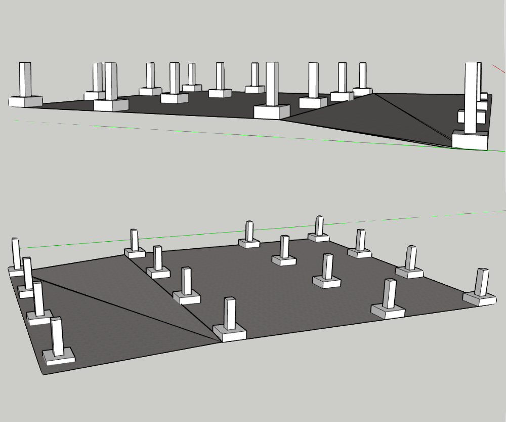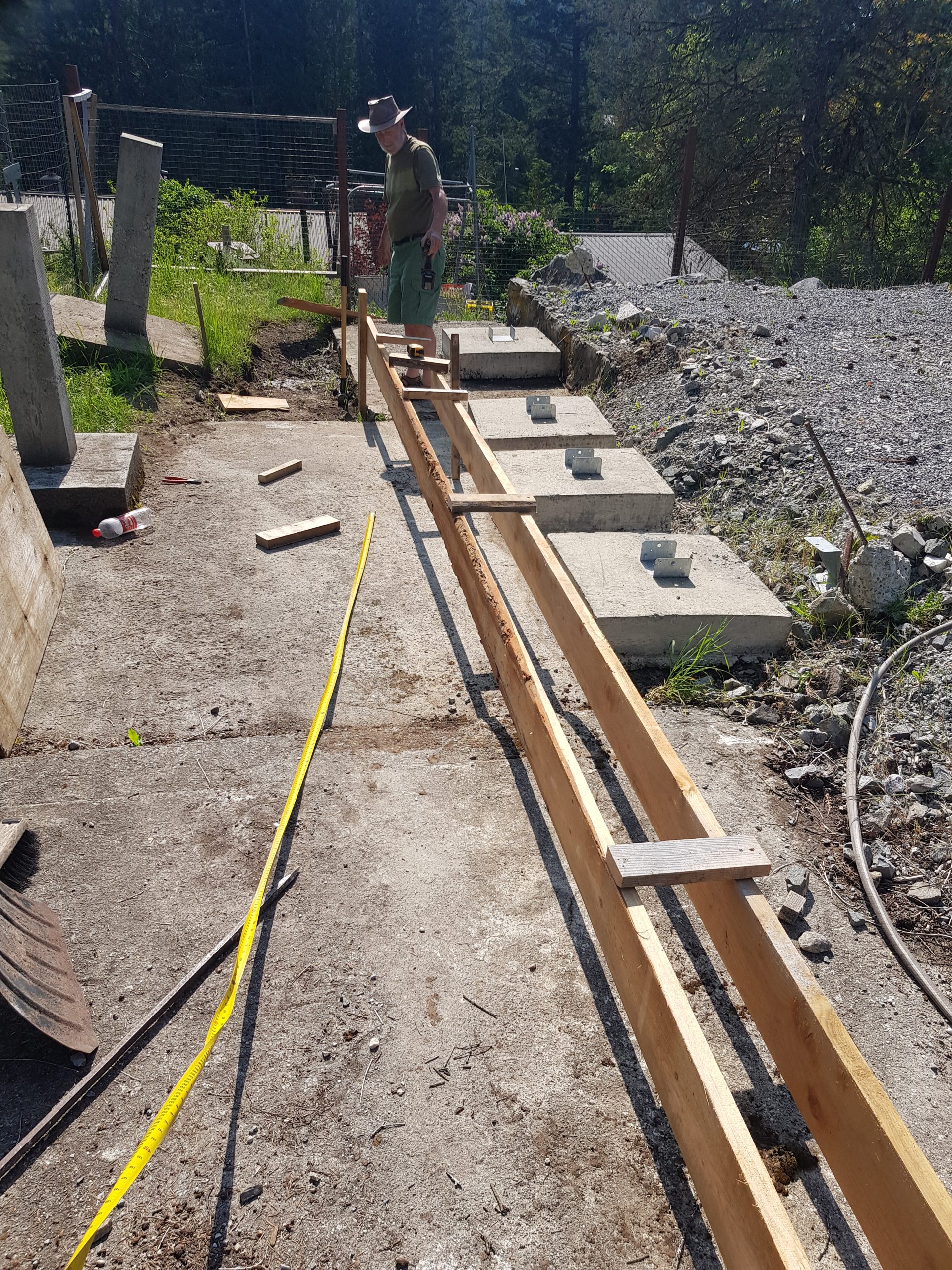 When building a house, you can build to suit the site or you can change the site to suit your design. Hardscaping and the heavy machinery involved are expensive. Since ours is a small budget venture, we wanted to use what was available on the land to the extent it was possible. One of the previous owners of the property had begun construction on a house. When we viewed the property we hoped we would be able to use the existing foundation. There was a grid of 16 piers and footings making up a rectangle of approximately 30’ by 40’. The alignment in all dimensions were…let’s say, questionable but workable. The first sets of building plans we workshopped all involved using the piers in a beam on pier foundation carrying a subfloor made from our trees.