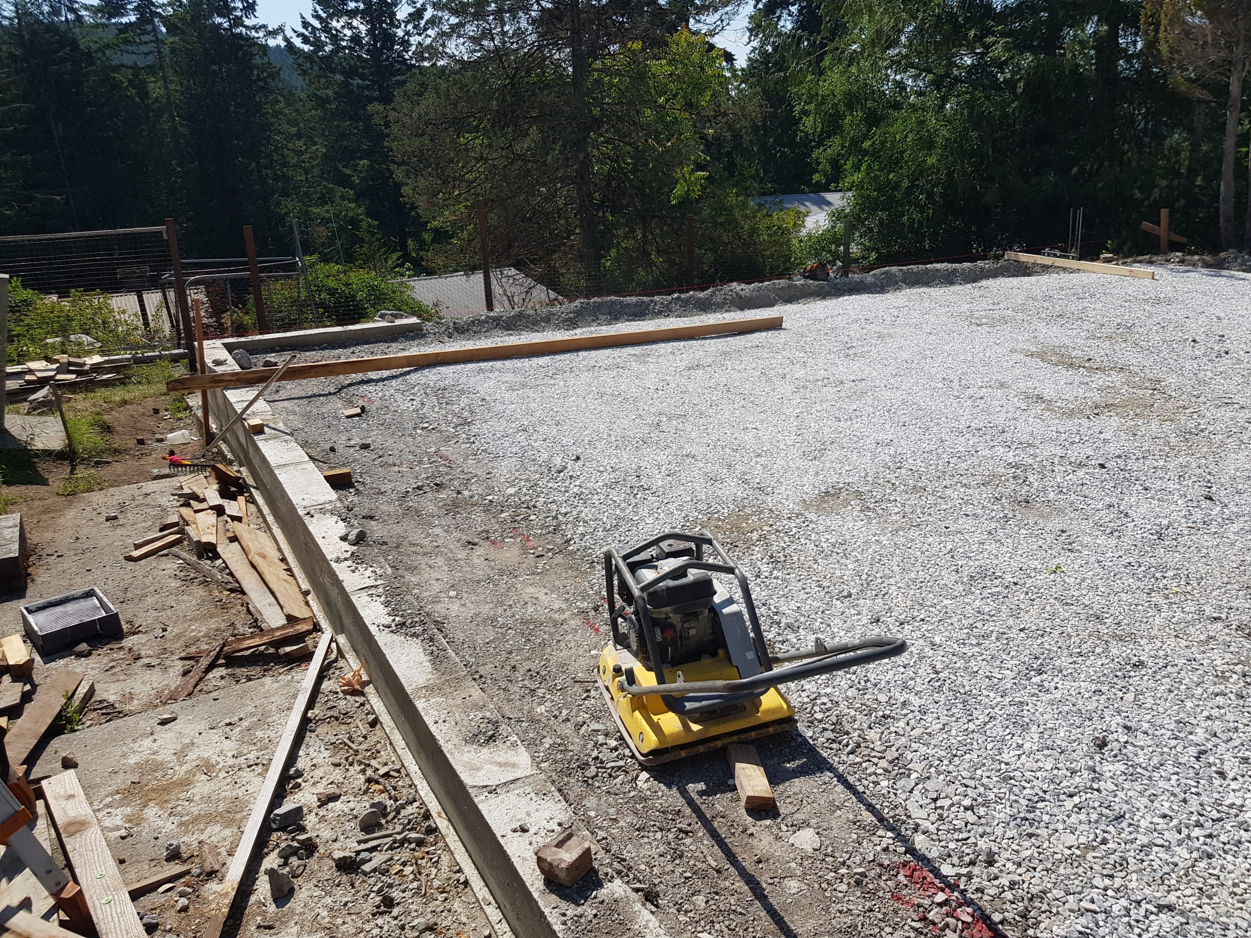 I didn’t take many pictures of the process. It was a rushed affair in the peak of summer heat and I was also replacing someone’s roof at that inopportune time. It amounted to a little over one cubic meter in the end, mixed from Navvy Jack and cement in a portable electric drum mixer. I then backfilled against the retaining wall, this time with a little help from a 1.8 ton John Deere mini-excavator that I traded my labor to use. I buried the remnant footings of the old foundation and started anew; tabula rasa.